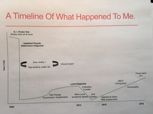 This is a one page summary of a complex six year health struggle. The trend line represents how I feel, with the top of the chart being optimal health, and the bottom being the worst health.